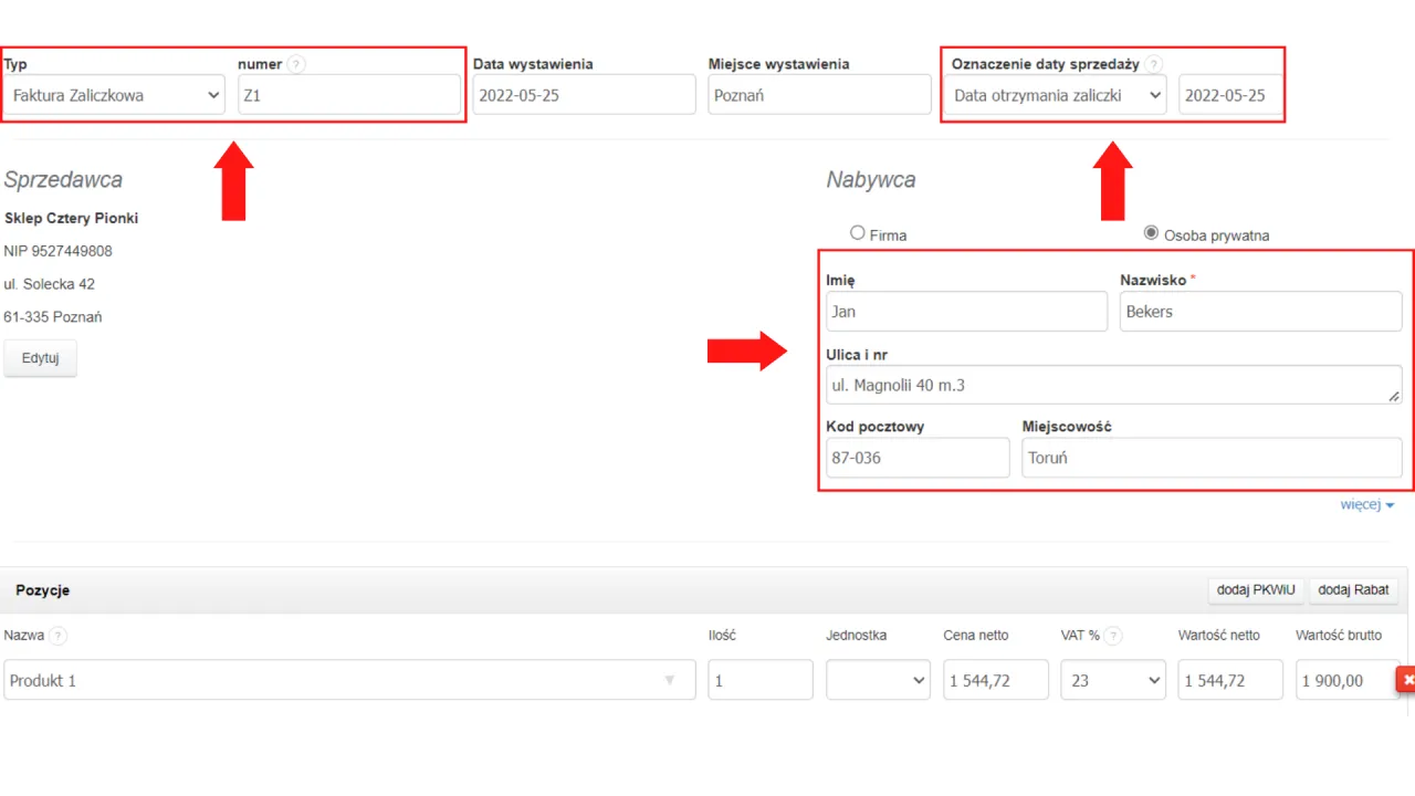 - Kwota zaliczki oraz opis przedmiotu transakcji